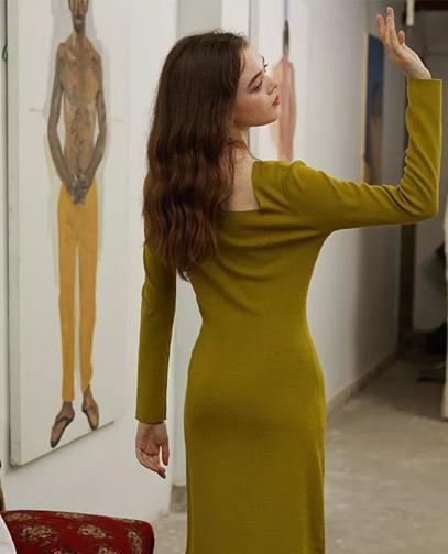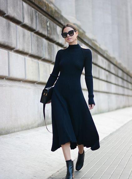 提到法式优雅怎能少了针织连衣裙。修身针织连衣裙代表了优雅的另一种解读,它是一种性感的优雅。这种性感的优雅不在于裸露,而在于一种若有若无的身材展现。