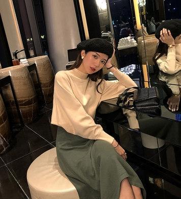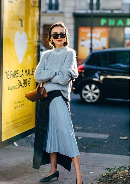 针织衫和长裙的搭配也必不可少,关键是如何运用色彩的碰撞。这种发灰调的军绿色,就是最具法国风情的复古色彩,搭配咖啡色、奶白色等针织衫最合适不过。但是,皮肤黑黄的美女不要尝试哦。