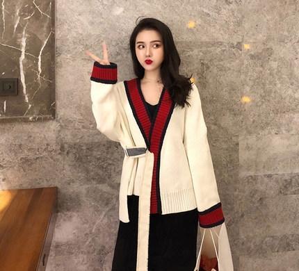 芩泽语家的这套衣服很独特,也很有设计感。里面是一件百搭款的针织长裙,外面原本也是一件普通款式的针织开衫,但却突如其来的采用了法式睡袍腰带的设计,让整体一下子多了几分慵懒和时尚。色彩上也很出众,大面积的黑与白,原本单调而无趣,但领口和袖口的复古红,却为这套衣服的配色画上了点睛的一笔。