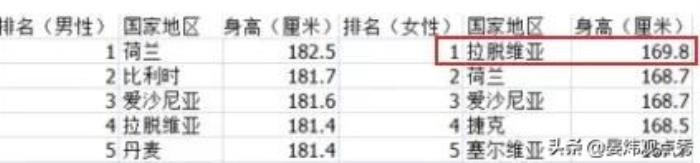 而根据英国BBC2016年发布的统计数据,全球女性平均身高最高的国家是拉脱维亚,为169.8cm。