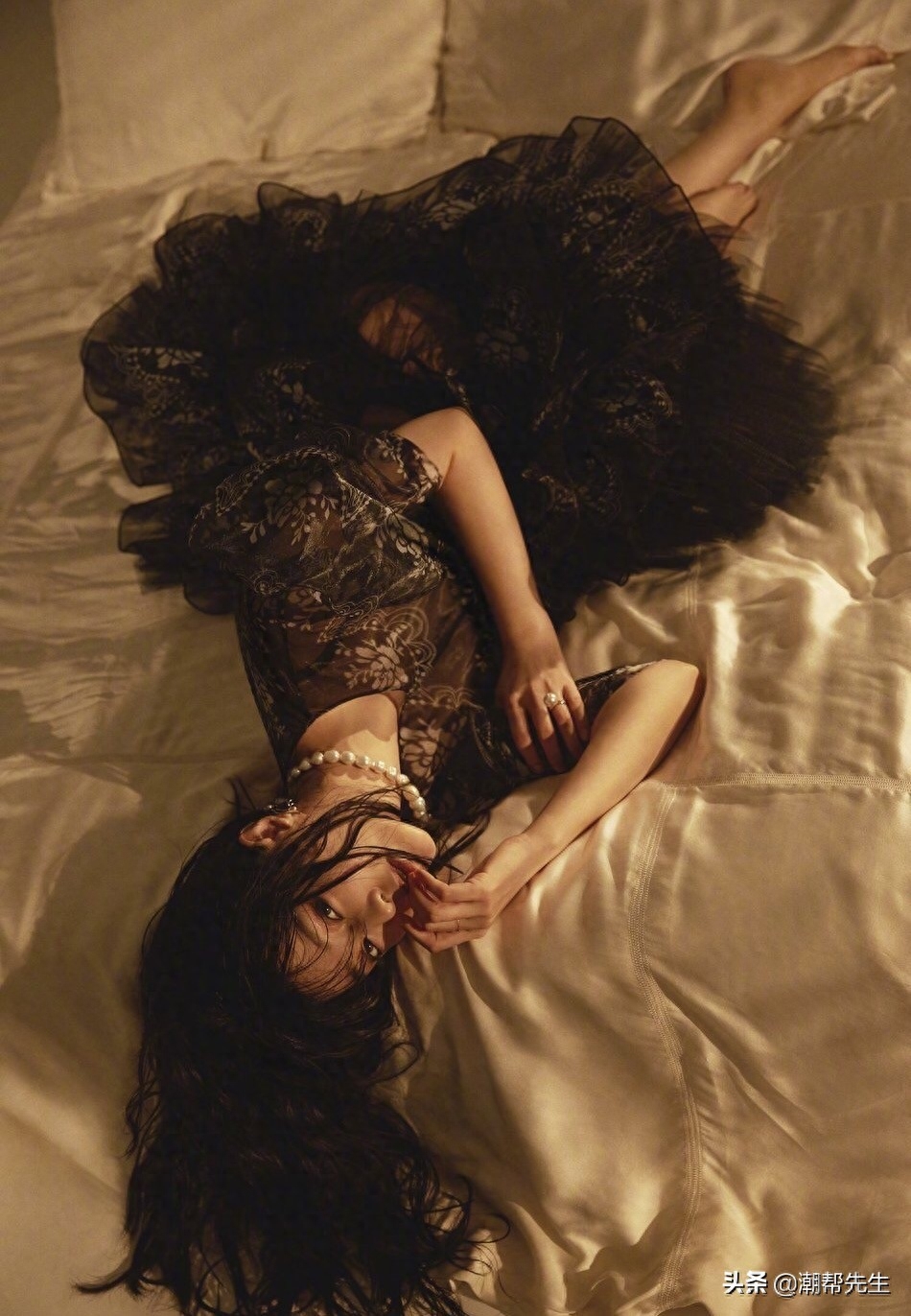 蕾丝一直都是范冰冰很喜欢的元素。这组杂志里也有一套黑色蕾丝裙子的造型。整个黑色蕾丝的网纱裙也是透视感十足,搭配肆意散落的长发和躺在床上的拍摄环境,也是气氛烘托满分。脖子上戴了一串大珍珠项链,很有法式贵妇人的感觉。手上的大钻戒也是抢眼的不行,就算是拍杂志也要透出“姐,就是富”的贵气来。