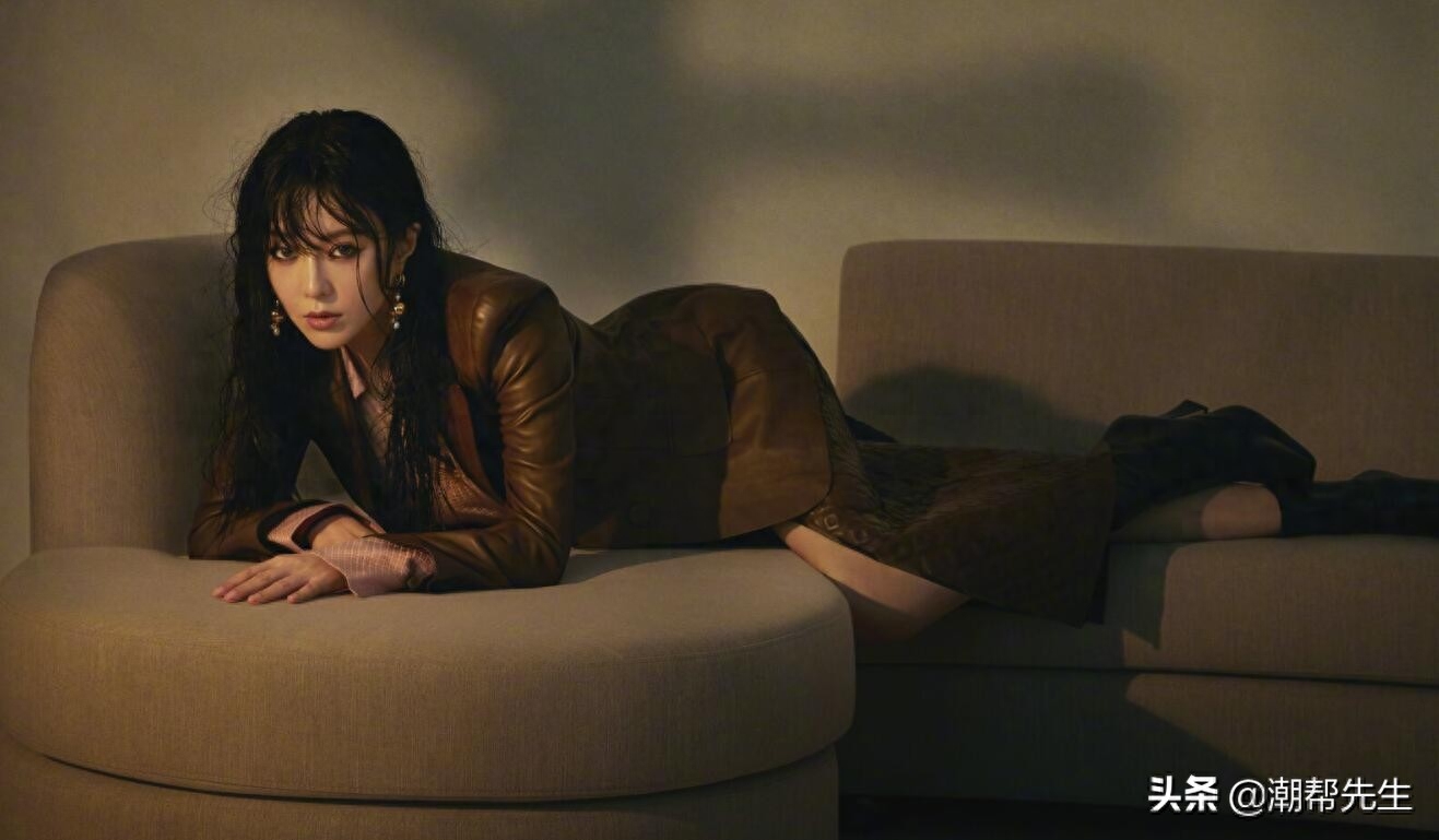 还有一张是穿着翻领的中袖棕色上衣,搭配一款爱马仕的腰包收腰。上半身是很保守正常的ol风格。下半身就不得了了,直接黑色内衣上阵,躺在沙发上的她也是勾人指数爆棚。交叉的大长腿,一览无遗。不知道范冰冰这组封面照的主题是不是:“我的腿怎么这么好看?”但是这个左腿怎么都给人一种p图过度的感觉,看起来的比例着实有点奇怪。