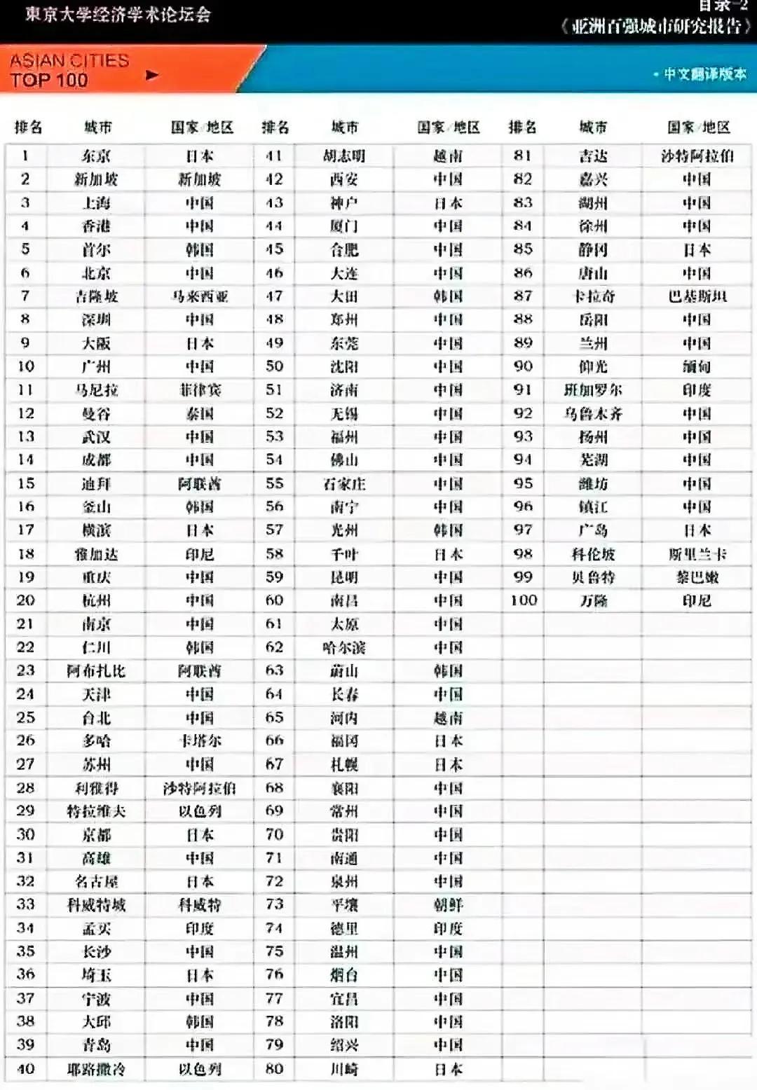 由东京大学经济学术论坛会发表的一份《亚洲百强城市研究报告》引起了大家的热议。