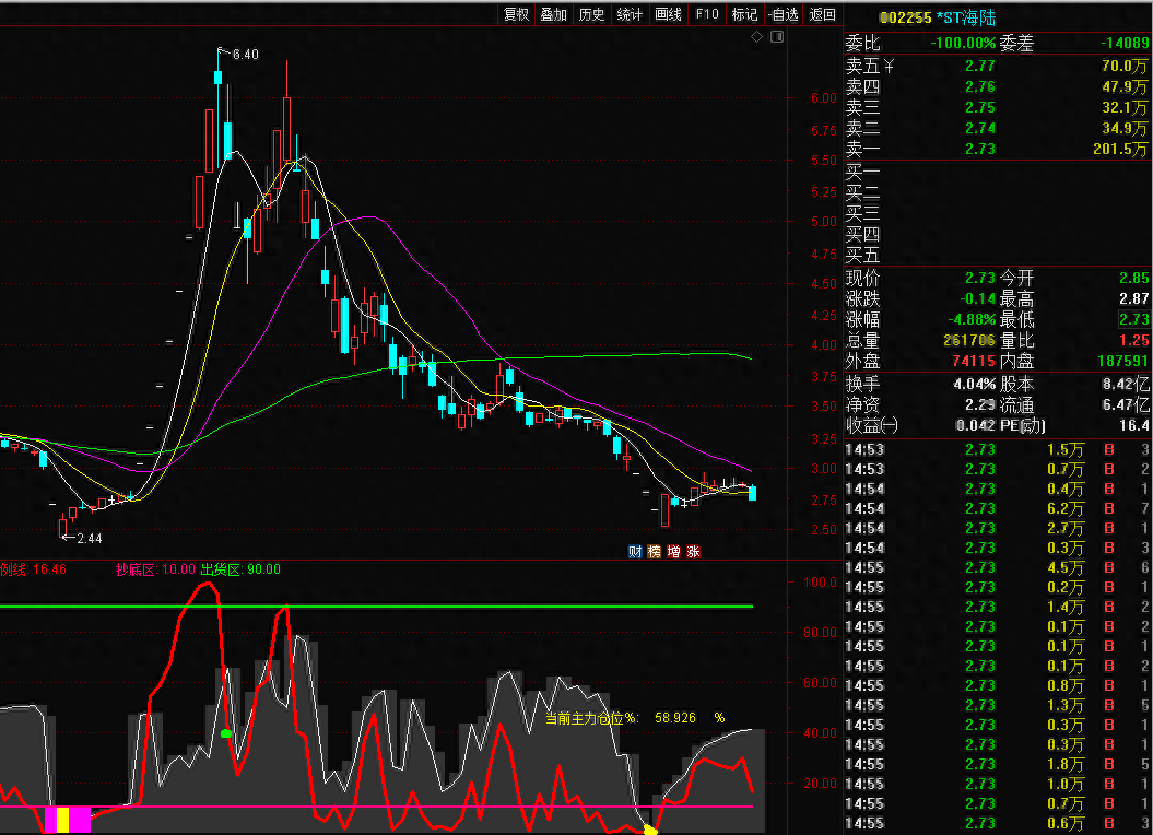 6,当红色曲线处于上方的出货区,且散户仓位超过50%时,表示散户不断进场接盘且赚钱比例超过90%,绝大部分个股短期内都会出现下跌甚至是反转,极个别有重大利好刺激且人气非常旺的股票则可能继续震荡上涨一段时间后才会反转。