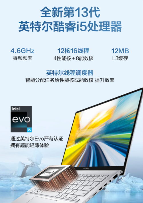,最高睿频提升至4.6Ghz,相比旧款12代酷睿器在能效、性能释放上都有不小进步,玩主流网游《DNF》、《英雄联盟》更加流畅,更不用说负载状况更低的办公场景,续航更久,电脑响应速度也要更快。