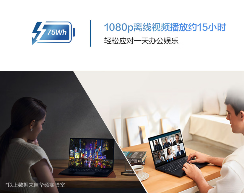 前面提到13代酷睿处理器对电脑的续航有提升,但一切的前提都离不开电脑的“大容量电池”,对比同期友商最高配置65Wh电池的产品,灵耀14 2025直接标配了75Wh长续航大电池,外出即便未携带电源适配器也无需担心续航问题。