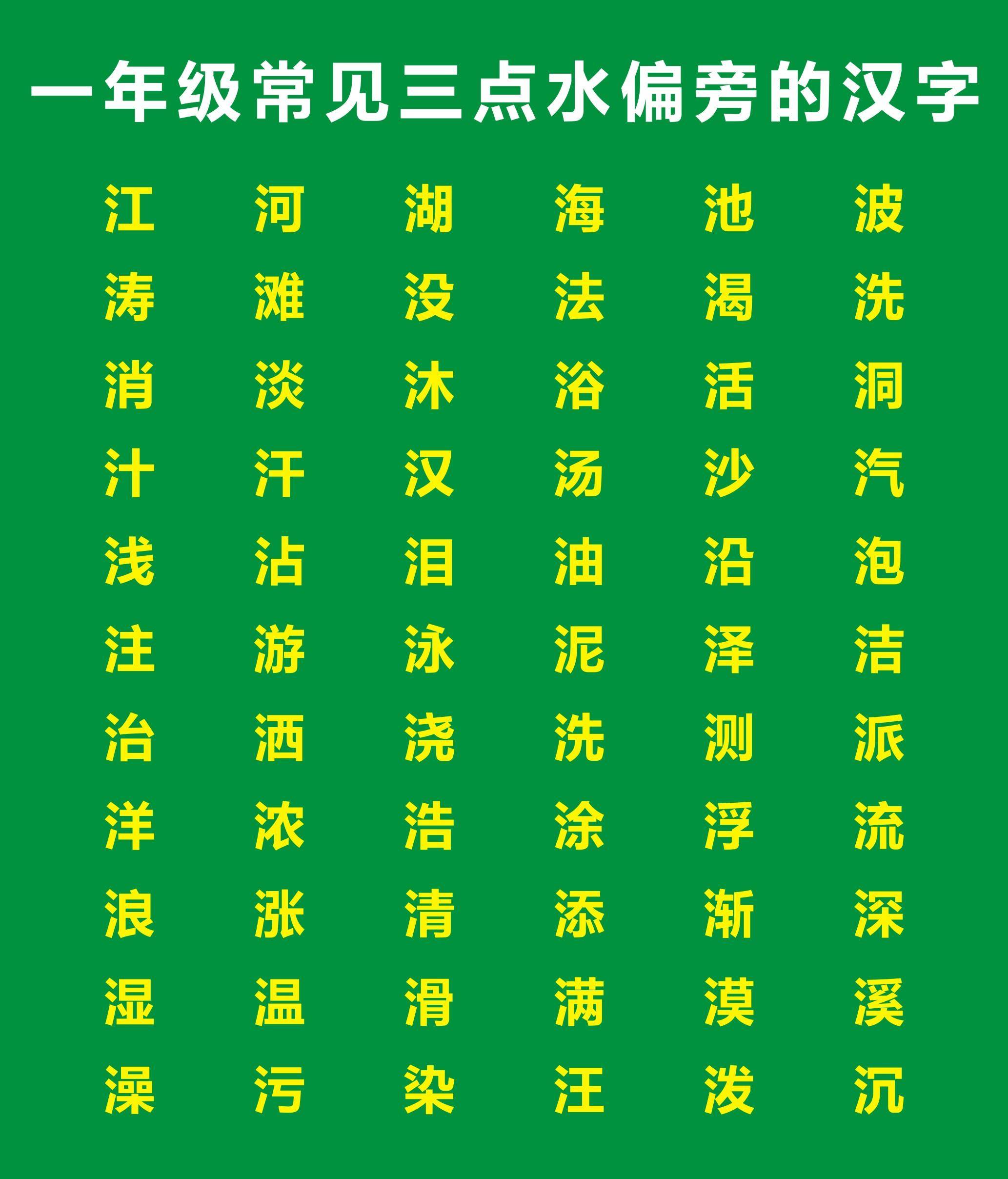 我们在一年级学习三点水这个偏旁部首,并且学习了三点水旁的汉字,顾名思义三点水旁的汉字大多和水有关系,那我们在一年级常见的有:江、河、湖、海、池、波、涛、滩、没、法、渴、洗、消、淡、沐、浴、活、洞、汁、汗、汉、汤、沙、汽、浅、沾、泪、油、沿、泡、注、游、泳、泥、泽、洁、治、洒、浇、洗、测、派、洋、浓、浩、涂、浮、流、浪、涨、清、添、渐、深、湿、温、滑、满、漠、溪、澡、污等等。