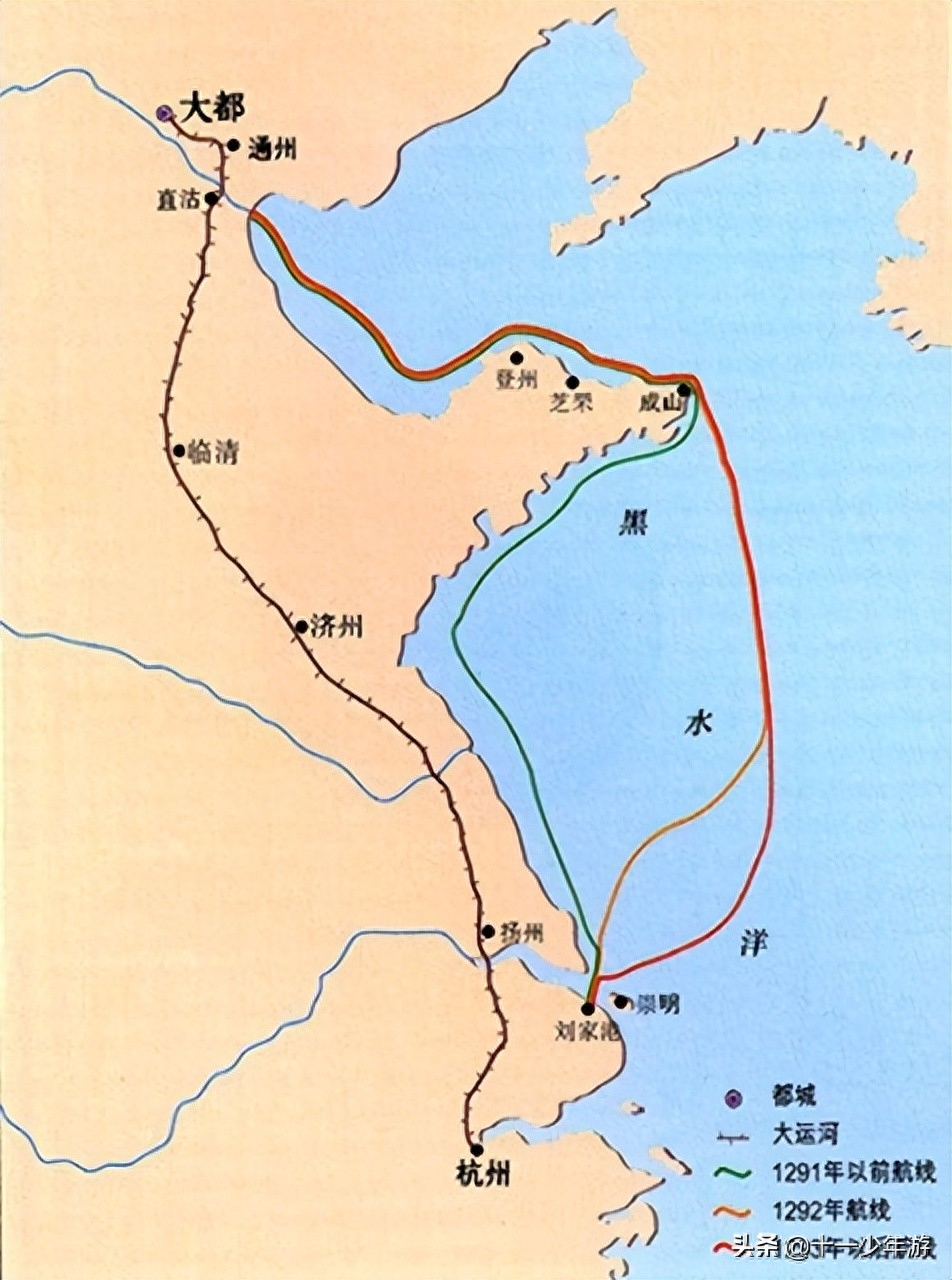 这条大运河,依然是从杭州出发,到达长江,到达扬州,从扬州北上,开始改道,经过山东的济宁,临清,一路向北,到达元朝的首都,大都。