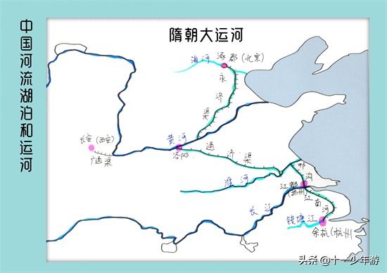 为了巩固统治加强南北政治经济文化的交流,公元605年,隋炀帝开始开凿运河。大运河的两个终点,一个中心点北端的终点,是在当时的涿郡,也就是现在的北京;南端的终点是余杭,也就是现在的杭州。还有一个中心点是洛阳