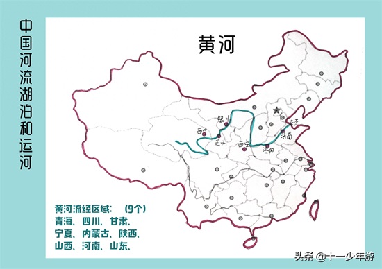 黄河流经的省份有九个:首先是发源地青海,很少一部分流经了四川北部,然后北上流经甘肃,宁夏,内蒙古,在内蒙古河口转而向南,流经山西,陕西,在陕西潼关转向东,流经河南,山东.青海,四川,甘肃,宁夏,内蒙古,山西,陕西,河南,山东。
