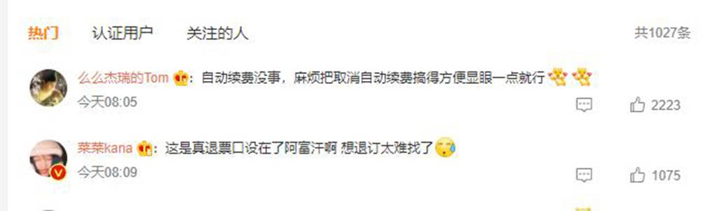 从评论区以及网友讨论话题来看,其实大家对于提前扣费的反感并没有那么大,而是对自动续费的退订模式有着很大的意见。在使用一个APP的时候,这个APP会“想尽办法”让你开会员,把“开通会员”看到最显眼的位置,但是当你追完剧或对这个APP没兴趣想要退掉自动续费服务时,很难找到“退订”的字样,有网友一针见血的形容道:“真是开通会员在自家门口,退订则需要在阿富汗啊!”