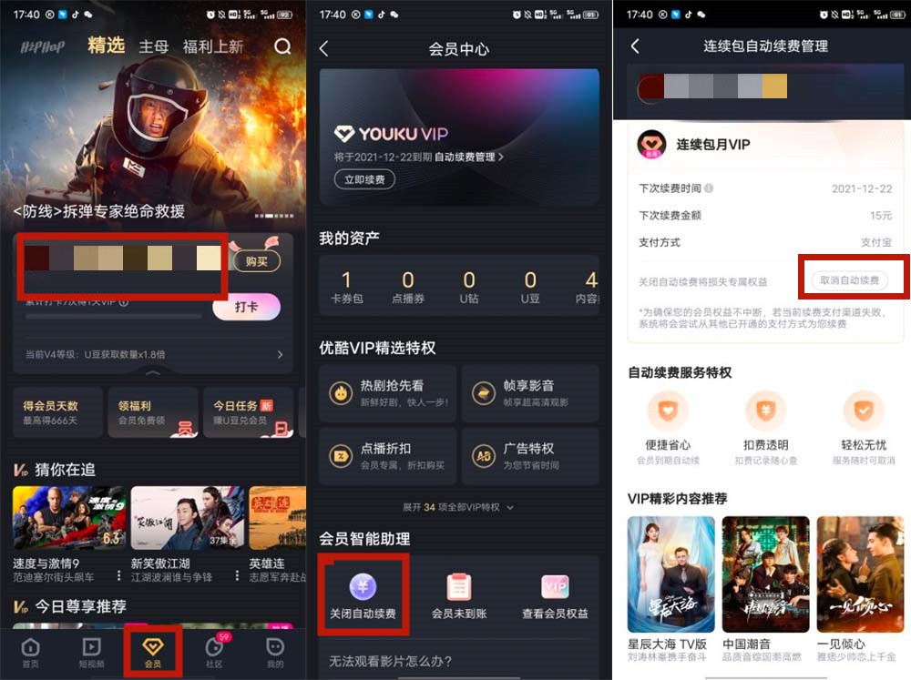 优酷的操作方法与腾讯视频相似:会员—点击头像—关闭自动续费—取消自动续费。
