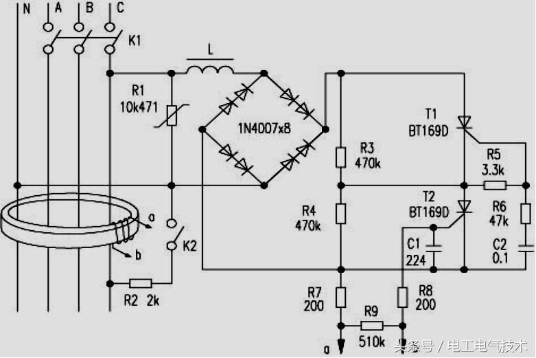 图中L为电磁铁线圈,漏电时可驱动闸刀开关K1断开。每个桥臂用两只1N4007串联可提高耐压。R3、R4阻值很大,所以K1合上时,流经L的电流很小,不足以造成开关K1断开。R3、R4为可控硅T1、T2的均压电阻,可以降低对可控硅的耐压要求。K2为试验按钮,起模拟漏电的作用。按压试验按钮K2,K2接通,相当于外线火线对大地有漏电,这样,穿过磁环的三相电源线和零线的电流的矢量和不为零,磁环上的检测线圈的a、b两端就有感应电压输出,该电压立即触发T2导通。由于C2预先充有一定电压,T2导通后,C2便经R6、R5、T2放电,使R5上产生电压触发T1导通。T1、T2导通后,流经L的电流大增,使电磁铁动作,驱动开关K1断开,试验按钮的作用是随时可检查本装置功能是否完好。用电设备漏电引起电磁铁动作的原理与此相同。R1为压敏电阻,起过压保护作用。 该断路器原理简单、零件少、维修方便,只是代换零件时一定要注意零件的可靠性和参数应符合要求。