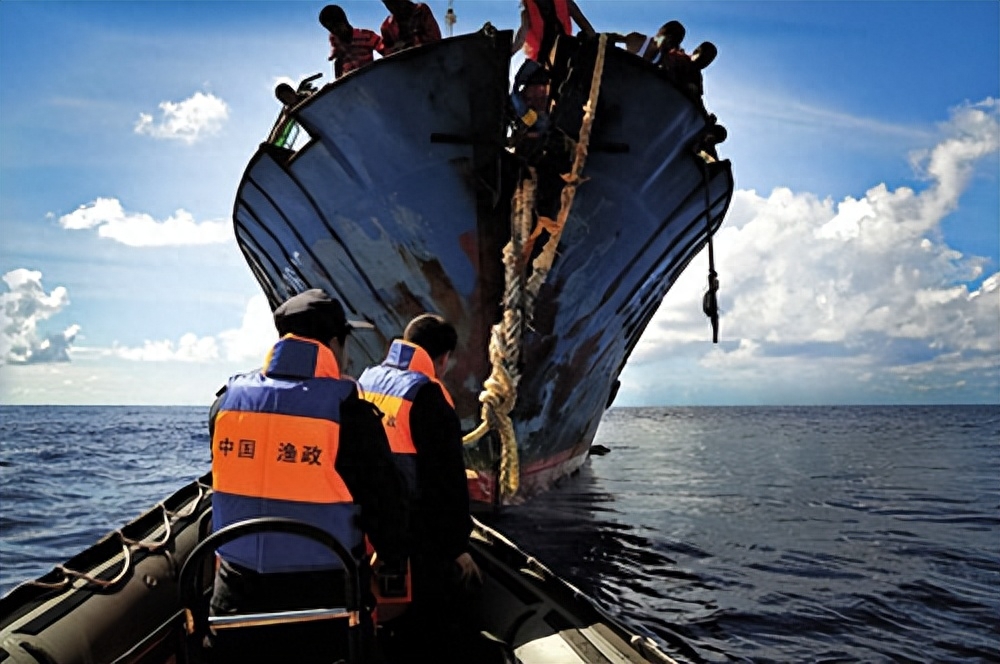 在这艘船的甲板之上,站着11名衣衫褴褛的船员,等待着救援。之后,救援行动随即展开。由于鲁荣渔2682号已经无法航行,中国渔政派出一艘118船拖带着鲁荣渔号返航。