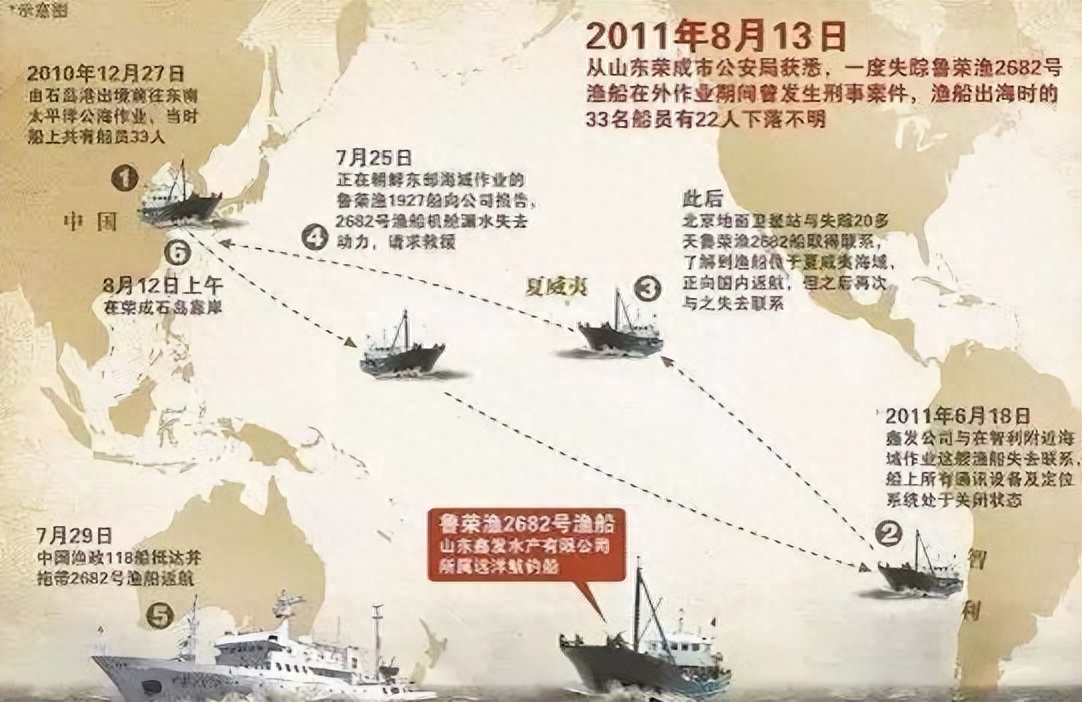 2011年8月1日,位于日本海以东,距离南鸟岛约300海里的海面上,中国海上搜救中心的工作人员发现了此前失联许久,无法动弹的鲁荣渔2682号远洋渔船。