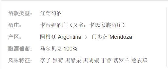 酒款:卡帝娜安洁莉卡萨帕塔阿尔塔马尔贝克干红葡萄酒