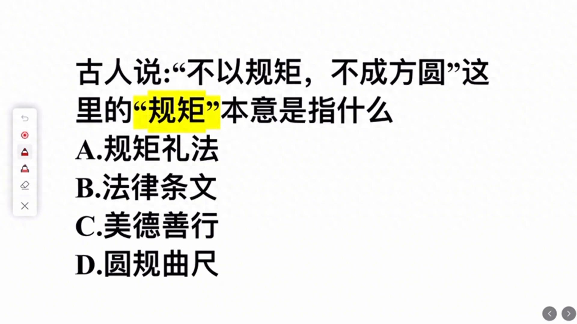 各位同学,你们好。今天来看这样一道题目。古人说:"不以规矩,不成方圆",这里的"规矩"本意是指什么?意思是:A.规矩礼法;B.法律条文;C.美德善行;D.圆规曲尺。