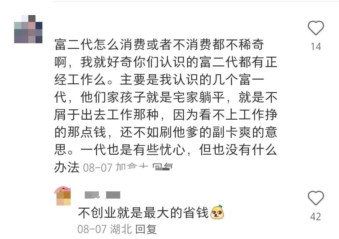 富二代的消费方式多种多样,每个人都有自己的生活方式。我好奇是否有富二代朋友有正经工作,但根据我认识的一些富一代和富三代的例子,他们有些宅家躺平,不愿意出去工作,因为他们看不上普通工作所赚取的收入,而更愿意依赖家族财富。