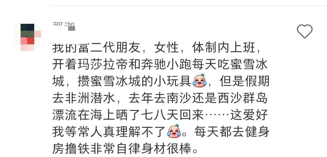 另一位女性富二代朋友,在体制内工作,拥有玛莎拉帝和奔驰小跑。尽管她每天都品味蜜雪冰城的美食,并收集蜜雪冰城的小玩具,但她也有着独特的嗜好,如前往非洲潜水、去南沙或西沙群岛漂流,度过充实的假期。她每天坚持健身,拥有出色的身材。