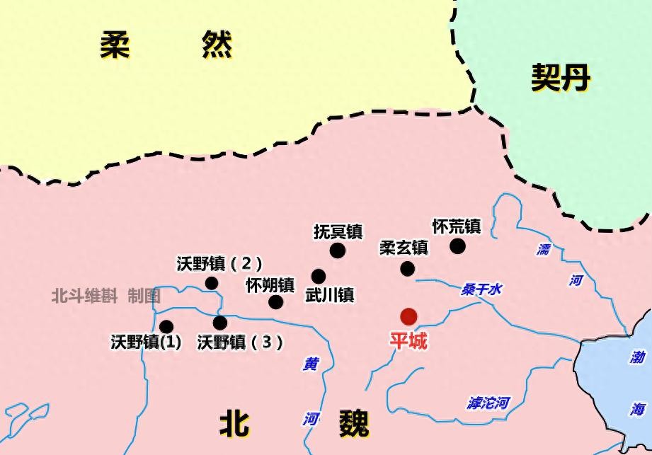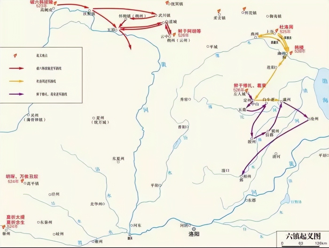 北魏孝文帝南迁都城洛阳后,北魏军队发生分化,跟着孝文帝迁入河南的部队成为了羽林、虎贲,勋贵与士族同列;相反防守边陲六镇(沃野镇、怀朔镇、武川镇、抚冥镇、柔玄镇、怀荒镇)的军队则从国之干城变成了乡下的破落户,六镇的将卒地位出现断崖式的下降。更加糟糕的是旱灾和雪灾也开始爆发,这就导致六镇的粮草出现了不足,六镇内部底层镇民对高层将领的不满日益加剧。