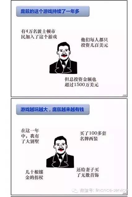 查尔斯·庞兹(Charles Ponzi)是一位生活在19、20世纪的意大利裔投机商,1903年移民到美国,1919年他开始策划一个阴谋,骗人向一个事实上子虚乌有的企业投资,许诺投资者将在三个月内得到40%的利润回报,然后,狡猾的庞兹把新投资者的钱作为快速盈利付给最初投资的人,以诱使更多的人上当。由于前期投资的人回报丰厚,庞兹成功地在七个月内吸引了三万名投资者,这场阴谋持续了一年之久,才让被利益冲昏头脑的人们清醒过来,后人称之为“庞氏骗局”。