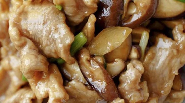 3、起锅烧油,油热后加入猪肉滑油翻炒后捞出,底油加入葱蒜炒香,再加入香菇翻炒,炒断生后加入肉片,调入盐、糖、生抽后起锅即可。