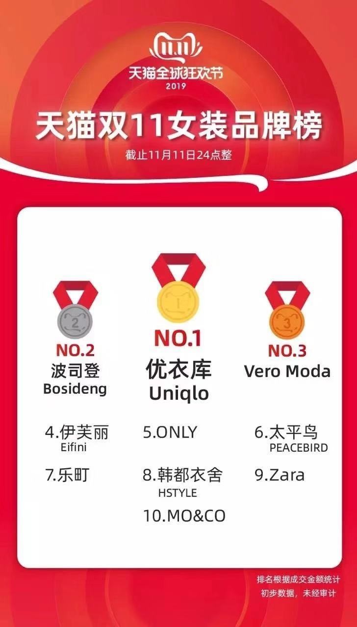 2019年双11,服装行业成为天猫平台最大的赢家,299个成交额破亿的品牌中,服饰品牌有83个,占比近三成。其中,优衣库、波司登、Vero Moda、伊芙丽、ONLY 位列双11女装品牌TOP5榜单。