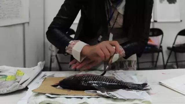 3、根据鱼身上的颜色调制不同浓淡或不同颜色的颜料,用刷子或毛笔在鱼身上的不同部位分别涂上不同的墨汁或颜料。