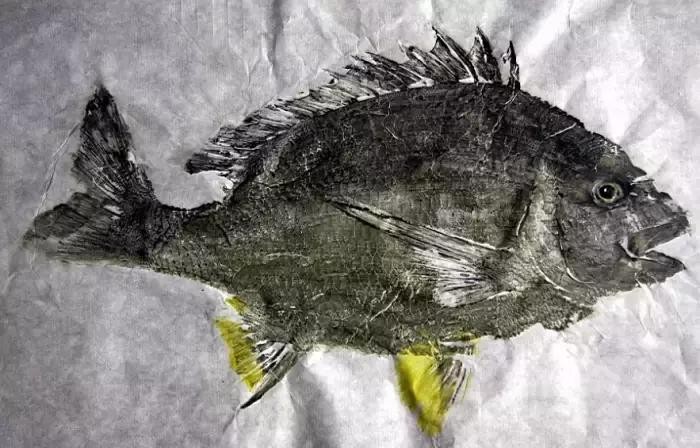 鱼拓是一种将鱼的形象用墨汁或颜料拓印到纸上的技法和艺术,起初鱼拓主要是垂钓者记录钓上的大鱼的实际尺寸,并留作纪念,后来发展成为一种艺术。