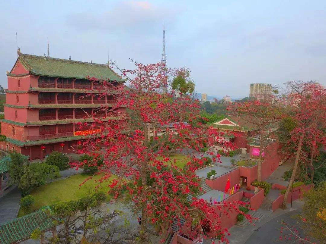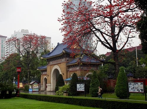 越秀山下的中山纪念堂也有几棵年代久远的木棉树,每到开花季节,红色调和纪念堂古朴典雅的建筑氛围,以及周边绿意盎然的景色互相映衬,充满活力。