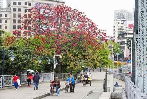 第一个地方是人民大桥北往南上桥位,这里有一棵古老的木棉树,花期来的时候,开得热情奔放。
