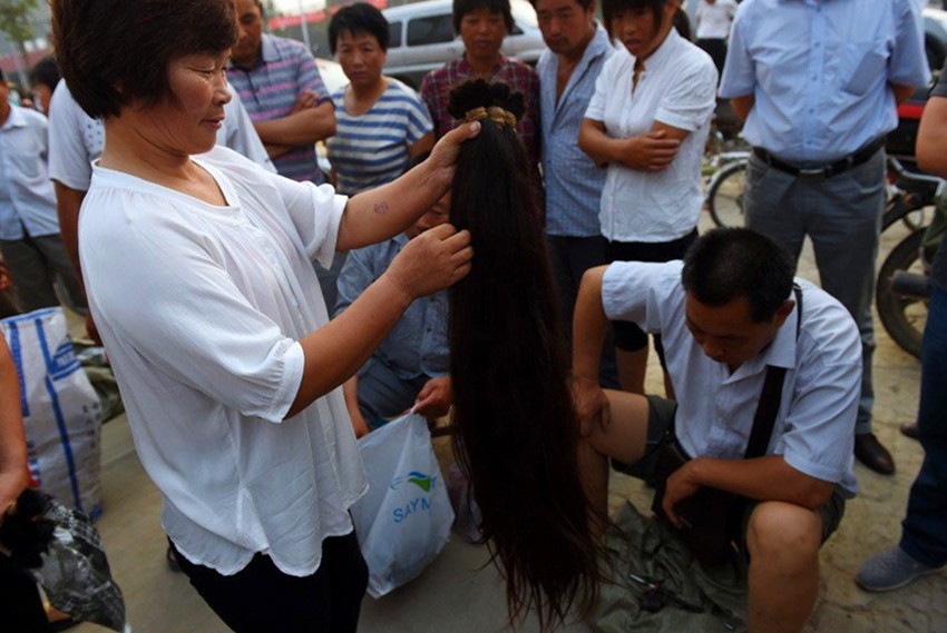 双方约定好了价格后,商贩就会拿出板凳、理发刀,将妇女留了几年的头发剪掉。