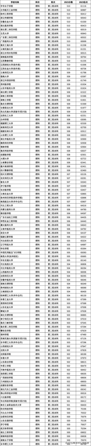 理科500分左右最难考的大学院校为中华女子学院,2023年最低分510分;500分左右最好考的大学院校为武汉体育学院、湖北工程学院、湖南科技学院、湖南女子学院、东华理工大学等高校,2023年最低分都在500分。