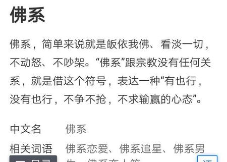 佛系,网络流行词,该词的含义是一种追求自己内心平和、淡然的活法和生活方式。大部分事情都想按照自己喜欢的方式和节奏去做。
