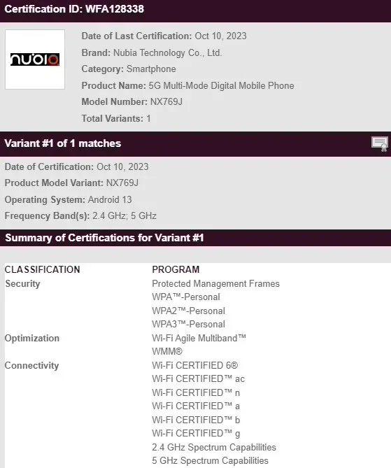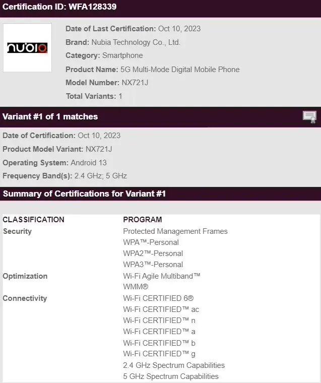 努比亚红魔 9 / Pro 也在几天前通过了 Wi-Fi 联盟的认证,确认出厂搭载安卓 13 系统,支持 2.4GHz 和 5GHz 频段 Wi-Fi 无线网络。