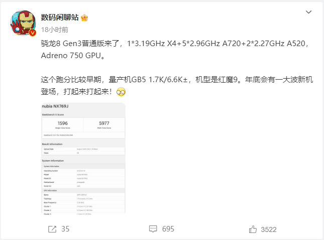 此外,一款搭载高通骁龙 8 Gen 3 标准版处理器的机型 —— 努比亚 NX769J 已在 8 月现身 GeekBench 跑分库,在 5.4.1 版本中单核成绩为 1596 分,多核成绩为 5977 分。根据 @数码闲聊站 透露的信息,该机预计是红魔 9 游戏手机。