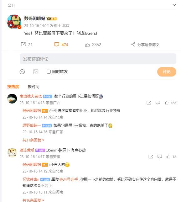 IT 之家 10 月 16 日消息,@数码闲聊站 今天下午又来了一次 " 一句话爆料 ":"Yes!努比亚新屏下要来了!骁龙 8 Gen 3!"