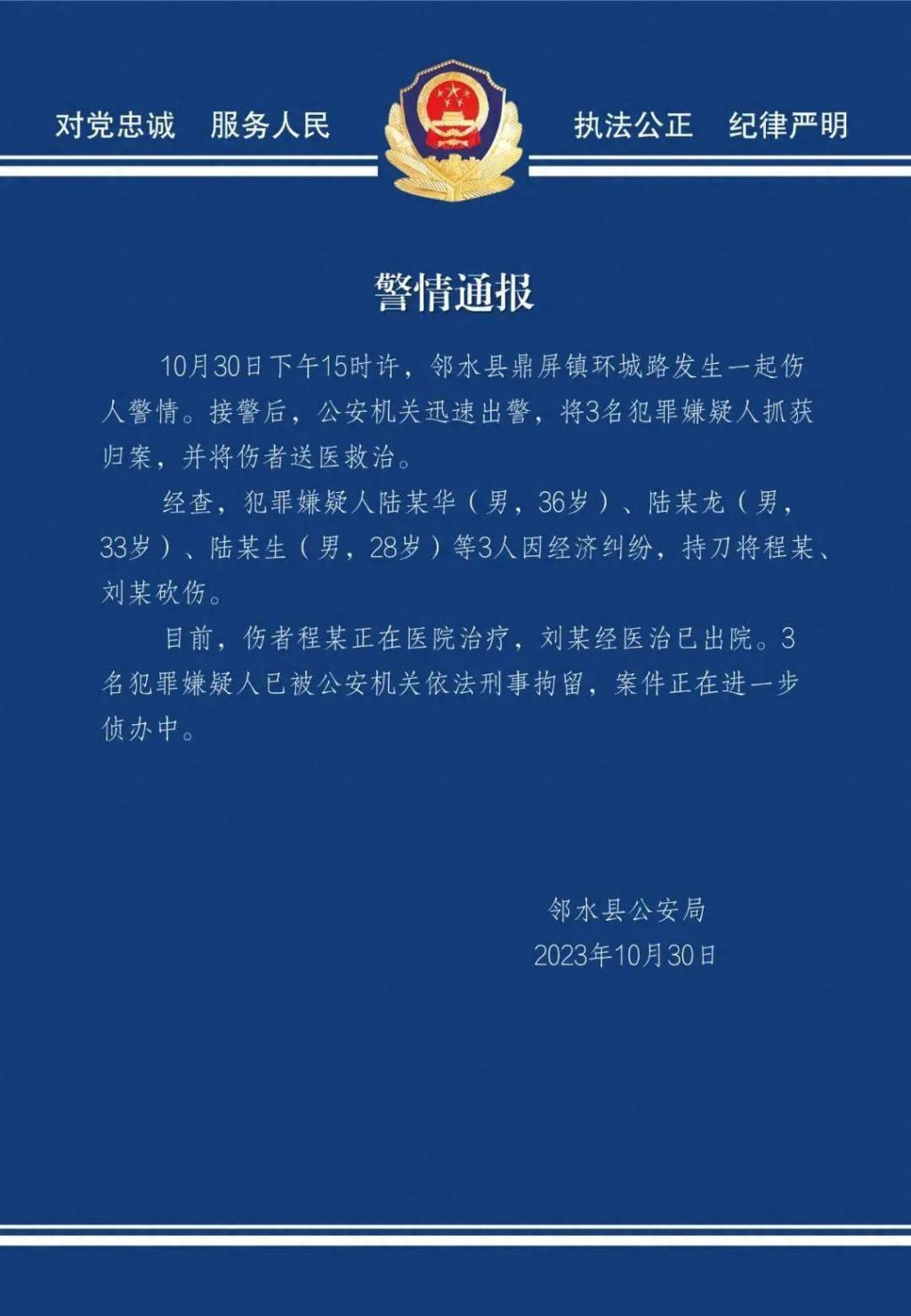 另据邻水公安发布警情通报:10 月 30 日 15 时许,邻水县鼎屏镇环城路发生一起伤人警情。接警后,公安机关迅速出警,将 3 名犯罪嫌疑人抓获归案,并将伤者送医救治。