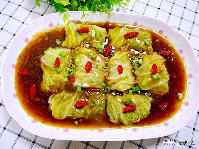 13、把糖醋汁浇在白菜卷上即可,撒点香葱、枸杞点缀一下。