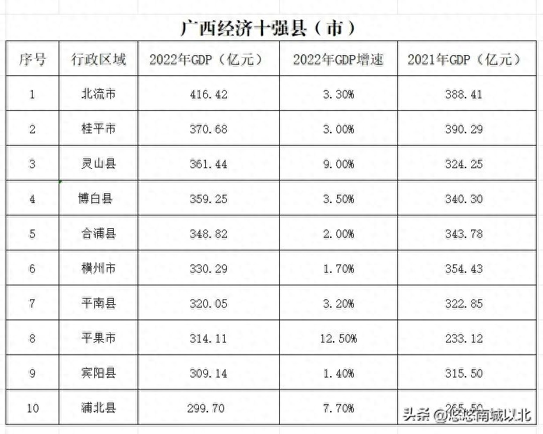 根据2022年广西各县市GDP总量情况,排名前十的为:北流市、桂平市、灵山县、博白县、合浦县、横州市、平南县、平果市、宾阳县、浦北县,具体如下: