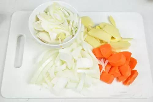 洋葱、红萝卜、葱、姜:切好后备用。