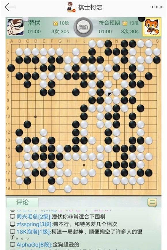 11月16日傍晚,连战连胜的符合预期,一跃成为金冠+10段。人们断定符合预期当属超级AI无疑,但却不知是何方神圣?在符合预期横扫了除柯洁之外所有人类顶尖棋手之后,棋迷们纷纷把目光投向棋界第一人潜伏(柯洁九段)。因为柯洁之前击败过CGI等AI,备受围棋爱好者们信任和推崇。如果此情此景是一幕好莱坞大片的话,天外来客如此肆虐,人类英雄是时候闪亮登场了。11月17日午夜将近,众多棋迷以为今天就这样度过了。不会再有什么大节目了,柯洁可能有所顾忌不会出手了。没想到柯洁突然接受了符合预期的挑战,惊喜的棋迷们狂刷“666”。猜到白棋的柯洁,再度祭出“模仿棋”,这是柯洁战胜各路AI的终极大杀器。11月10日正是凭借这一秘密武器,柯洁战胜了台湾围棋人工智能CGI。前10手转眼落下,符合预期第11手落子天元,已成为AI“破解”和挣脱模仿棋枷锁的标准动作。