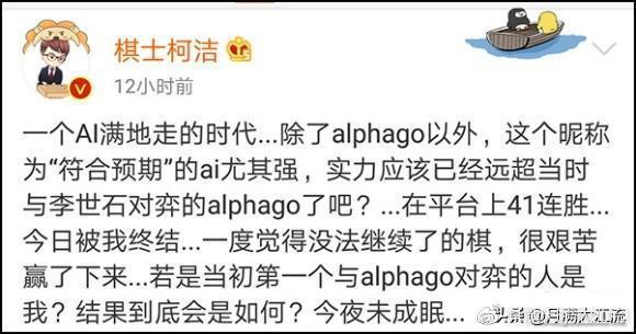 2017年11月15日下午,一个昵称为“符合预期”的神秘账号,在野狐围棋悄悄上线,开始了神挡杀神的表演。“符合预期”赢了整整三天,横扫棋坛金银冠棋手,打破了野狐围棋41连胜的记录。