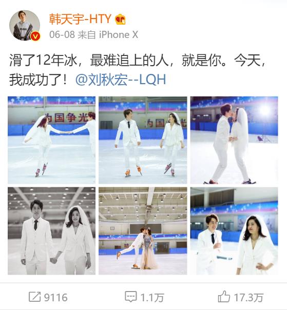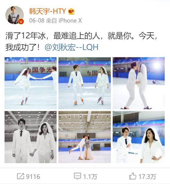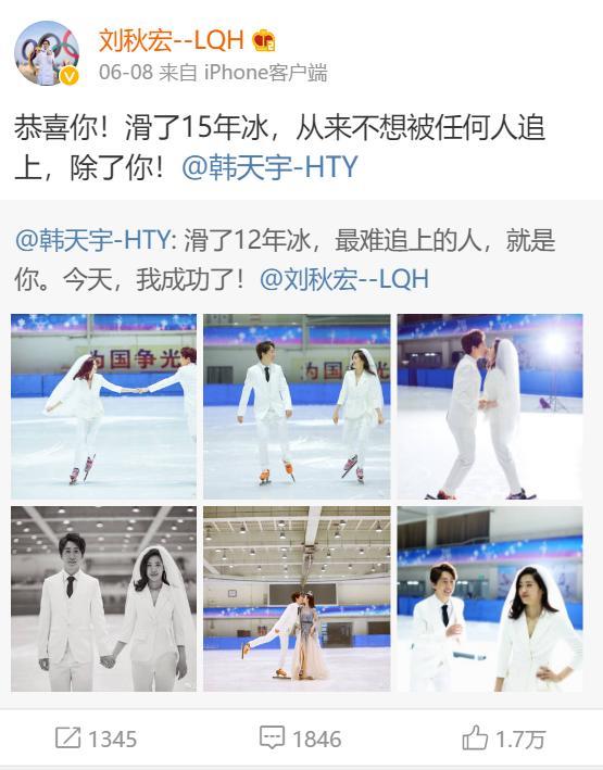 此前,韩天宇在社交平台公布了这一喜讯。他说:“滑了12年冰,最难追上的人,就是你。今天,我成功了!刘秋宏。