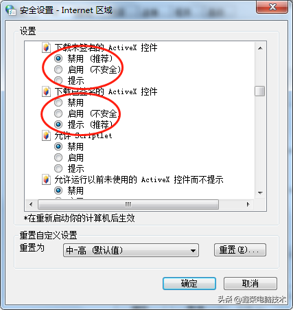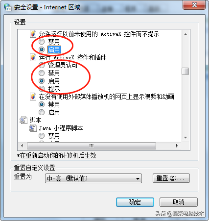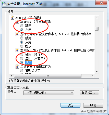 在控制面板里面找到Internet选项,在窗口中选择"高级",点击"重置";在弹出的对话框里再点"重置",想要彻底重置可以将"删除个人设置(P)"选项前打上√,重置后再把ActiveX控件和插件相关选项都改成"启动"或者"提示"就可以了。