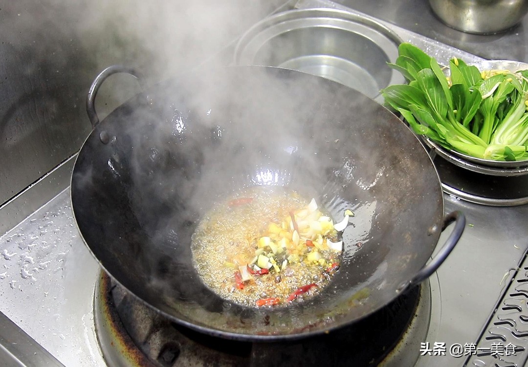 起锅烧油,油温五成热时,放入豆瓣酱10克,把豆瓣酱炒香、炒出红油,再放入葱、姜等辅料,把料头爆香。
