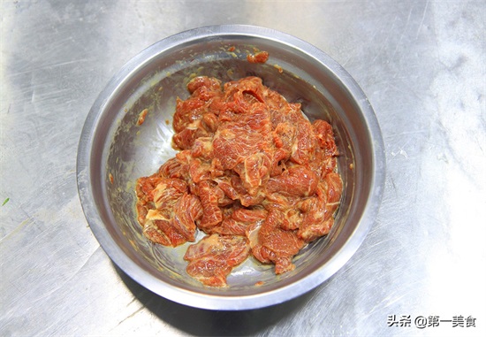 盆中加入食盐2克,白糖少许提鲜,鸡精1克,胡椒粉1克,料酒5克去腥,老抽2克提色,抓拌至牛肉把料汁全部吸收。
