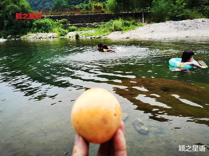 下山后,在溪边玩水,吃桃子,酷暑顿消,尽享旅途之乐。