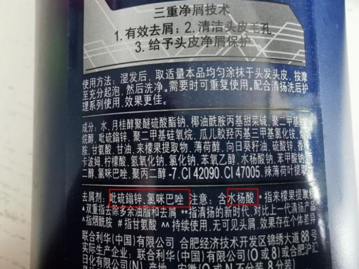 成分:清扬去屑成分含三种,吡硫翁锌、氯咪巴咗,上文有提到,这两种去屑成分有效果但是对头皮还是有一定的刺激性的。另外添加了水杨酸,通过来削弱分解头皮角质层来达到去屑目的吧!
