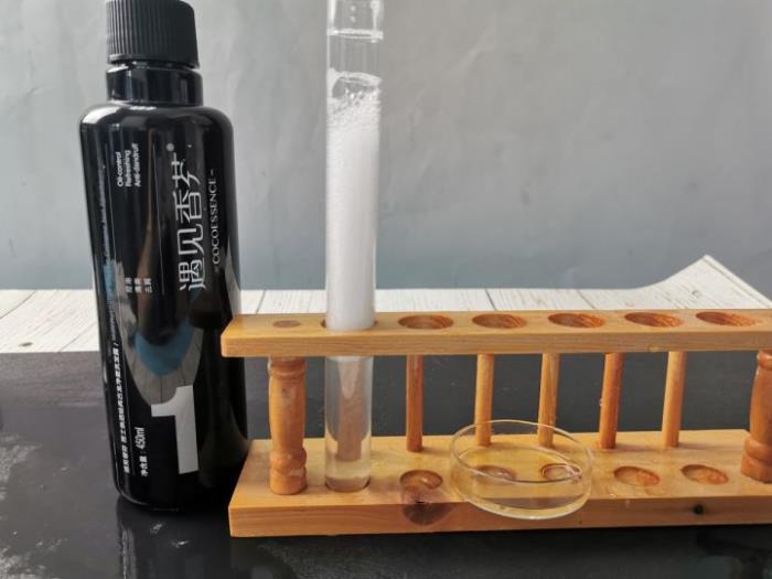 泡沫水质:泡沫比细腻的,起泡量一般。水质比较浑浊,几乎和泡沫颜色相当,无法分辨,试管下有白色沉淀物的化学物质。
